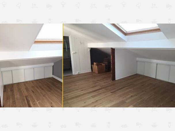 Spécialisée dans les travaux de rénovation à Paris, notre société cherche également à vous rendre la vie quotidienne plus simple. L’aménagement de la chambre en est le parfait exemple. Nous avons non seulement réhabilité le réseau électrique mais nous avons aussi voulu maximiser les espaces de rangements. L’aménagement des combles par la pose de placards spéciaux a ainsi permis de transformer cet espace, jusqu’ici inutilisé, en un espace plus fonctionnel offrant de nombreux rangements.